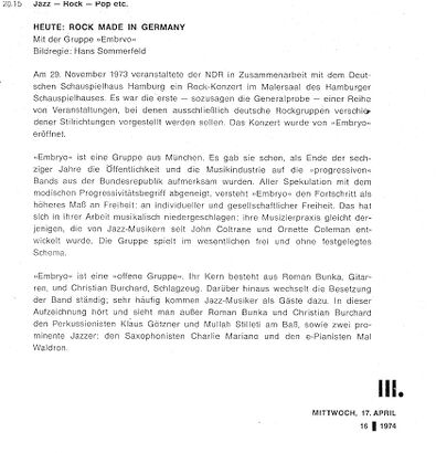 Embryo Live in Hamburg, Schauspielhaus Malersaal 1973/11/29
