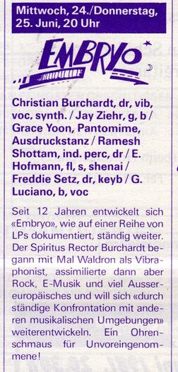 For 12 years, “Embryo” has been constantly evolving, as documented on a series of LPs. The spiritus Burchard began with Mal Waldron as a vibraphonist, but then assimilated rock, serious music and much non-European music and wants to develop further “through constant confrontation with other musical environments”. A feast for the ears for the unbiased!