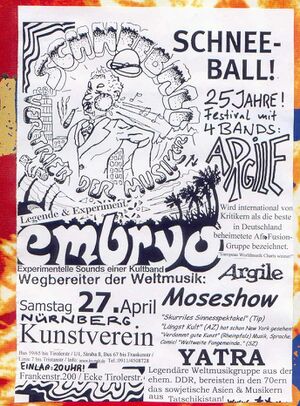 On April 27, 2002, 25 years of Schneeball will be celebrated with an event featuring four bands or projects from today's Schneeball scene: Embryo, Argile, Yatra and the Mose Show.